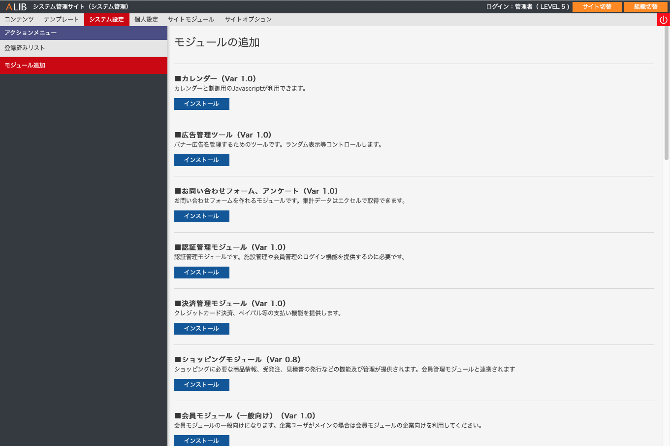 ボタン一つで追加できるモジュールはサイトに必要な機能を追加できます。アンケート、広告バナー管理、カード決済、会員管理システムモジュールなどが提供されています。